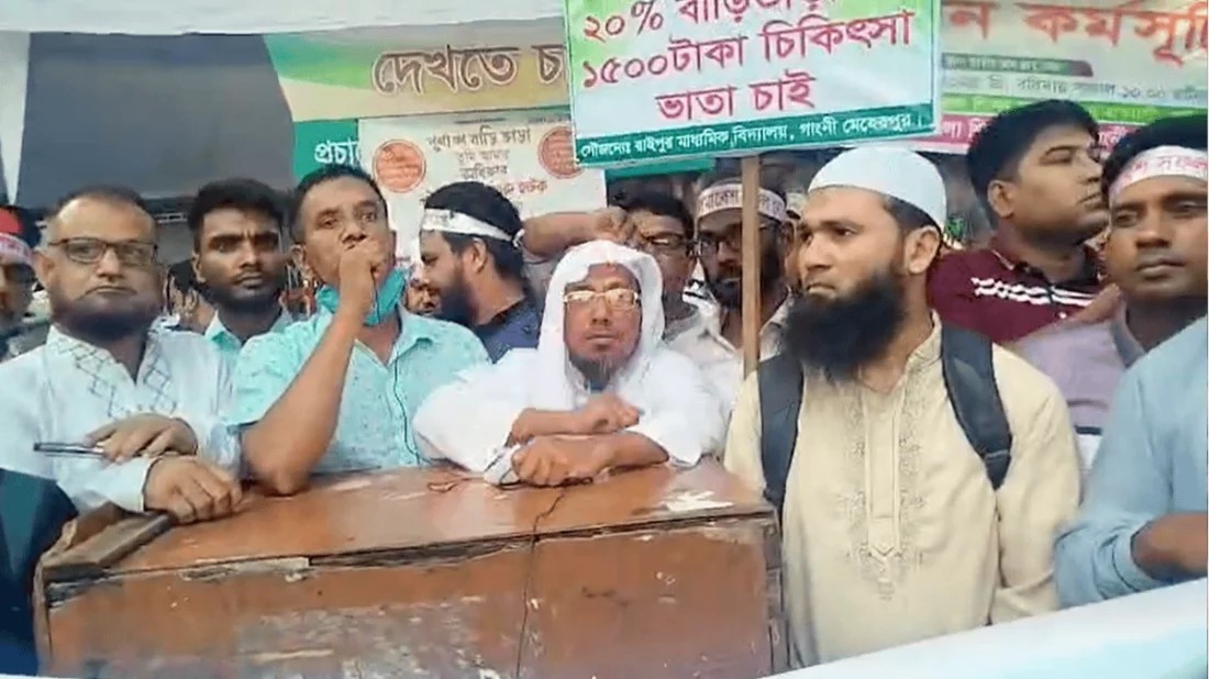জোটের সদস্য সচিব অধ্যক্ষ দেলাওয়ার হোসেন আজিজী বলেন, ‘সরকারের ঘোষিত বাড়িভাড়া ভাতা বৃদ্ধিকে আমরা অপ্রতুল ও অবাস্তব মনে করি। আমাদের দাবি না মানা হলে আজ সন্ধ্যার মধ্যেই সারাদেশে টানা কর্মবিরতির ঘোষণা আসতে পারে।’