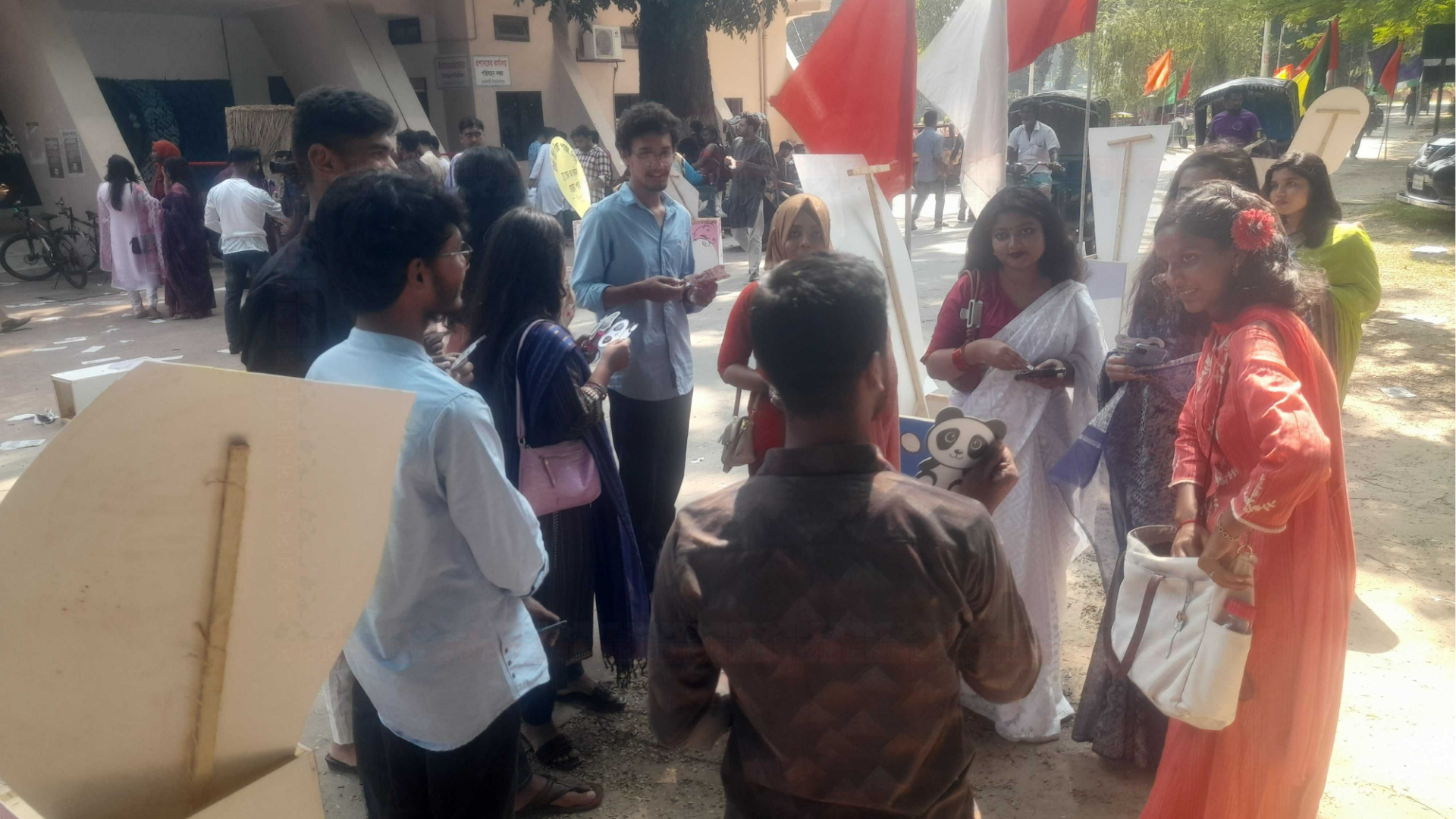 আজ সোমবার (১৩ অক্টোবর) সকালে বেশিরভাগ প্রার্থী কাজী নজরুল ইসলাম মিলনায়তনের সামনে অবস্থান নেন। এদিন সেখানে অনুষ্ঠিত হয় ২০২৪-২৫ শিক্ষাবর্ষের নবীনবরণ অনুষ্ঠান।