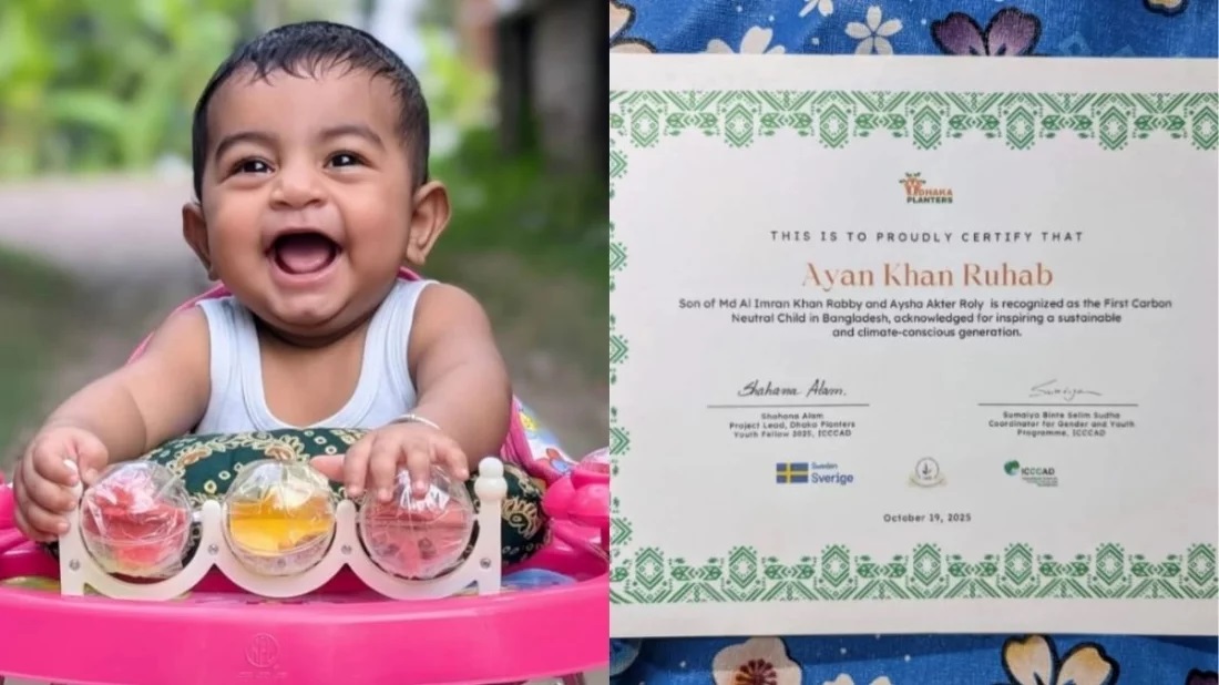 প্রথমবারের মতো বাংলাদেশে ‘কার্বন-নিউট্রাল শিশু’ হিসেবে আন্তর্জাতিক স্বীকৃতি পেয়েছে সাতক্ষীরার তালা উপজেলার শিবপুর গ্রামের শিশু আয়ান খান রুহাব। মাত্র ৮ মাস বয়সেই এই বিশেষ স্বীকৃতি অর্জন করেছে রুহাব।