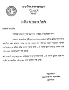 ময়মনসিংহ সিটি কর্পোরেশন নাগরিকদের জন্য হোল্ডিং কর পরিশোধে বিশেষ সুযোগ ঘোষণা করেছে।